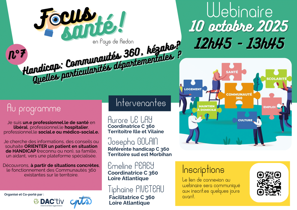 Initiative de la CPTS Pays de Redon et du Dac’tiv, Antenne de Redon, nous avons le plaisir de vous présenter un tout nouveau format de webinaire, spécialement conçu pour répondre à vos besoins en matière d’information et d’échange dans le domaine de la santé et du social.