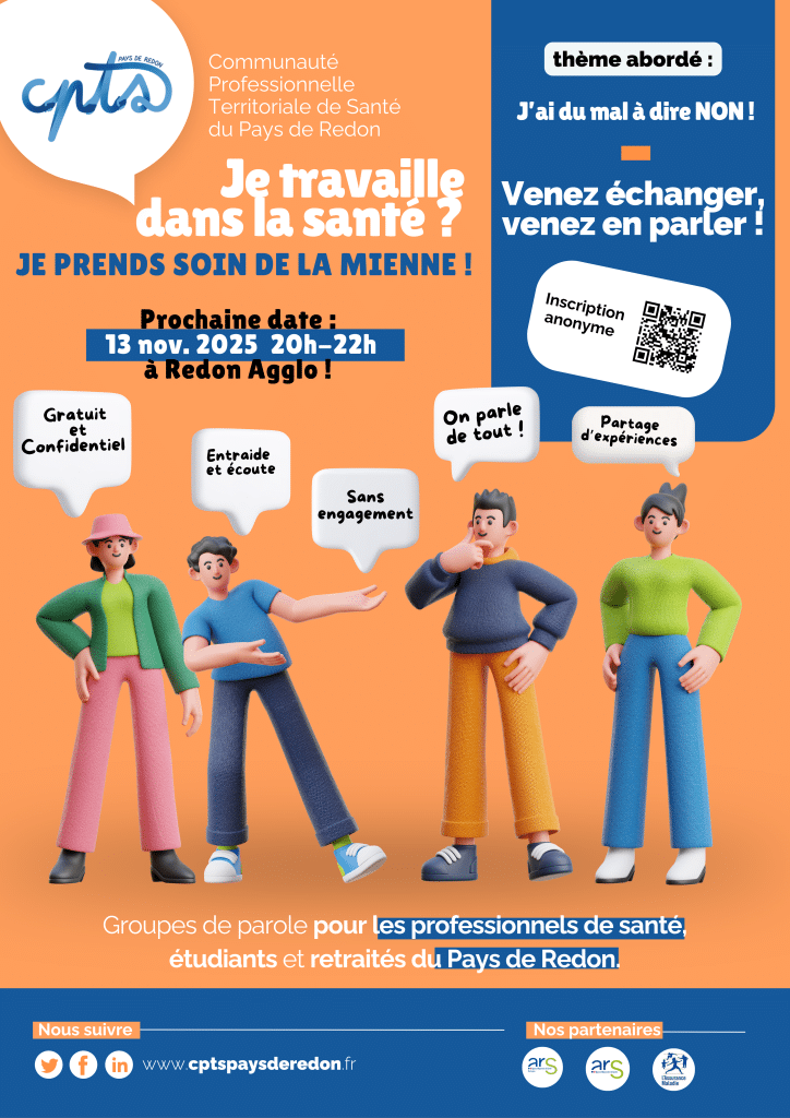 Il s’agit d’une opportunité pour vous, professionnels de santé libéraux ou salariés ou bien encore, étudiants en santé du pays de Redon, de partager vos expériences, de discuter de difficultés rencontrées spécifiques à votre activité et de trouver un soutien mutuel ou d’identifier des ressources.