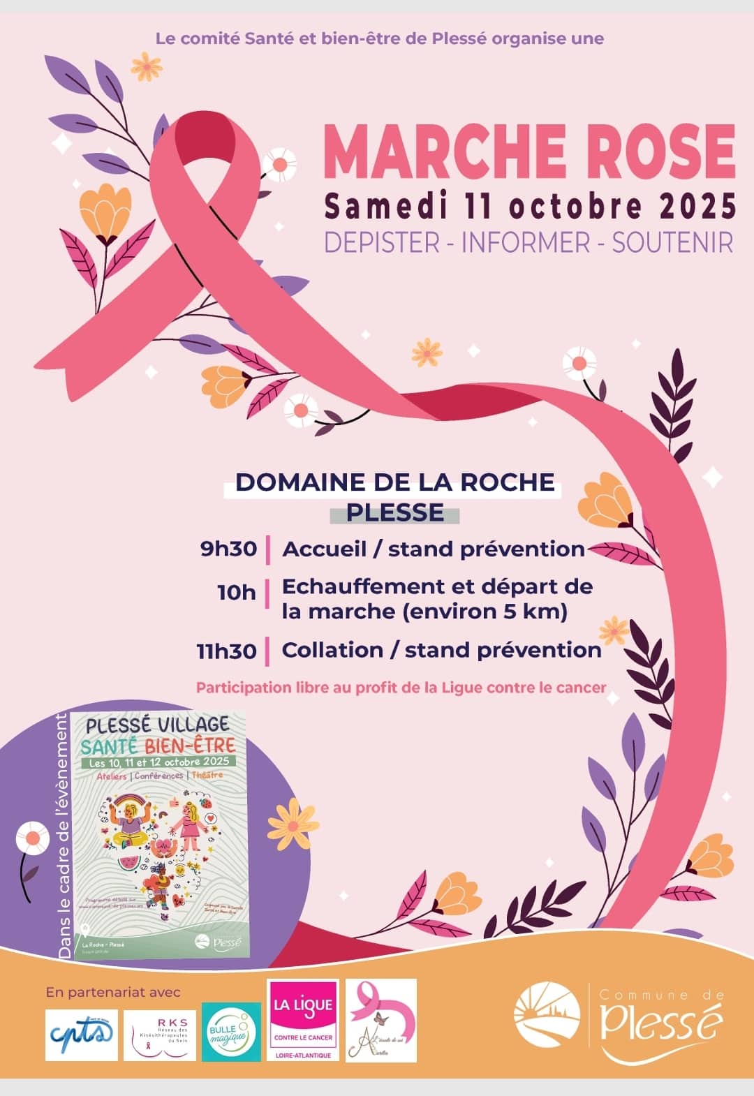 Le comité Santé et Bien-être de Plessé a le plaisir de vous inviter à participer à la Marche Rose organisée dans le cadre d’Octobre Rose, le mois de sensibilisation au dépistage du cancer du sein.
